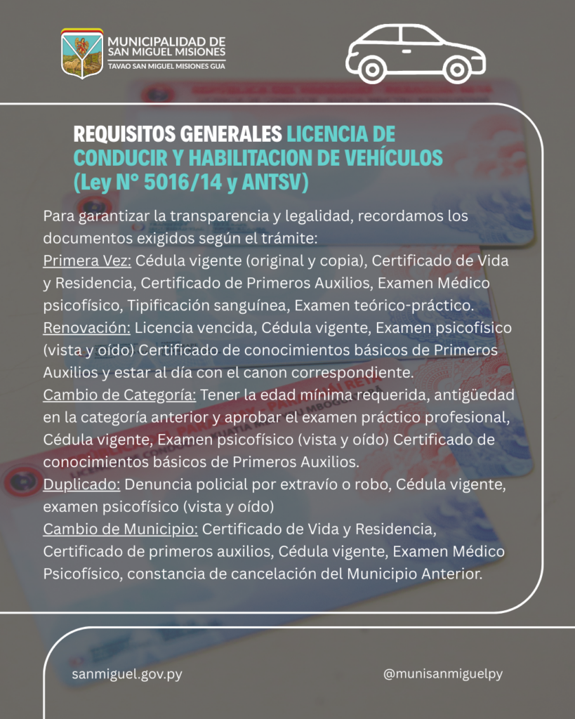 En el marco de la normativa vigente y con el objetivo de garantizar procesos claros y ordenados, la Municipalidad recuerda a la ciudadanía los requisitos generales exigidos según el tipo de trámite, conforme a la Ley N.º 5016/2014 y disposiciones de la ANTSV: